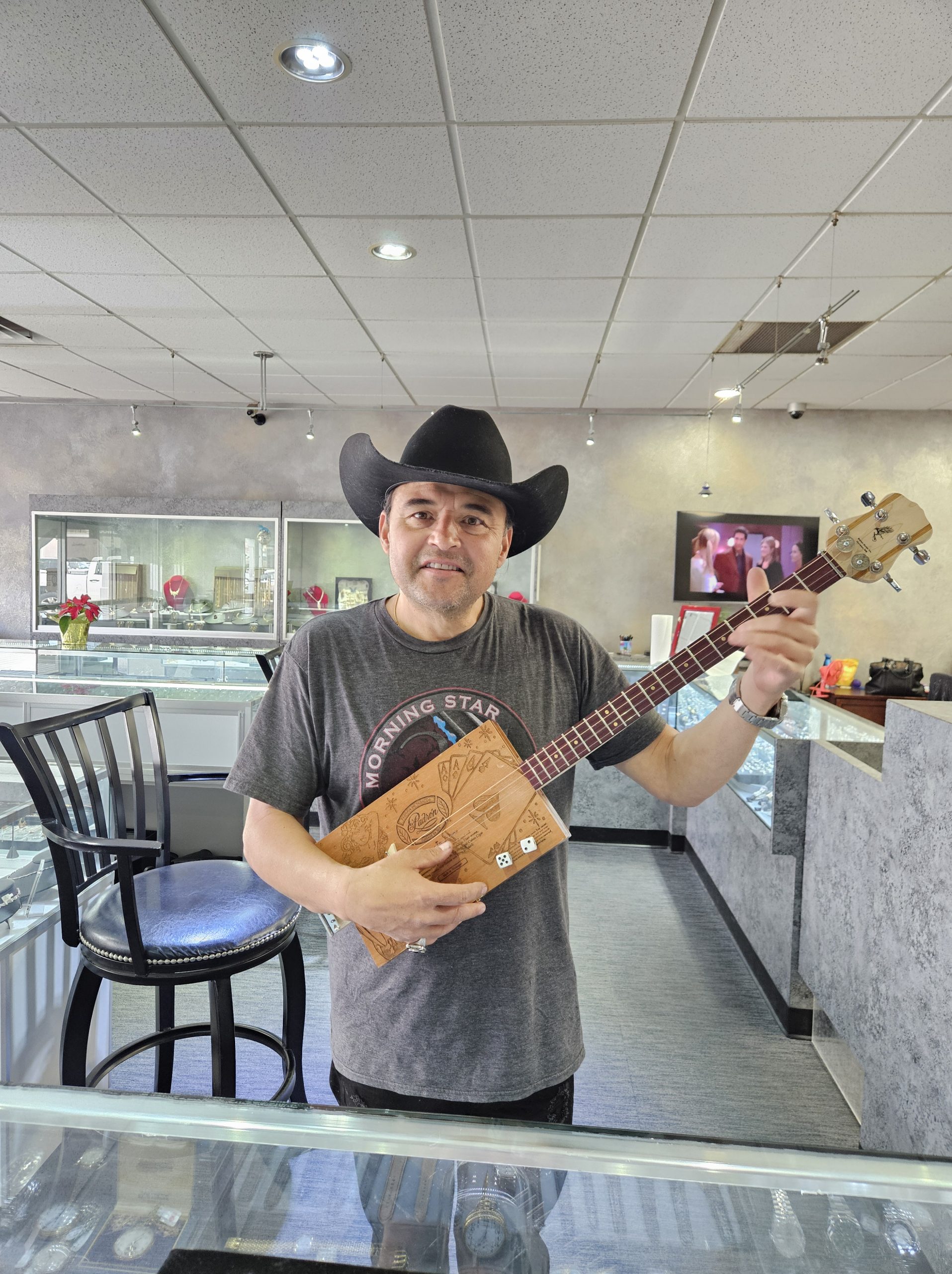 Robert uses high quality materials like maple and walnut to bring you excellent sound. The pickups in the cigar box guitars are piezo electric and are hidden inside the guitar. The piezo pickups allow for volume and tone contol. The handmade necks go completely through the body of the guitar for durability and stability.